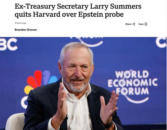據報道,哈佛大學在25日的一份聲明中表示,薩默斯的離職“與哈佛大學正在對愛潑斯坦案相關文件進行的審查有關”。