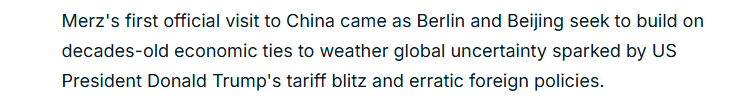 報道還強調(diào),默茨是繼英國首相斯塔默、法國總統(tǒng)馬克龍和加拿大總理卡尼之后,近幾個月來又一位訪問中國的西方領(lǐng)導人,而這些訪問正值美國政府對長期貿(mào)易伙伴征收關(guān)稅引發(fā)連鎖反應。