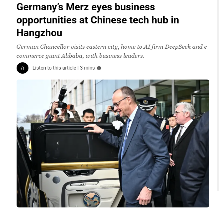 半島電視臺網(wǎng)站26日發(fā)表題為《德國總理默茨正著眼于中國杭州這座科技之城的商機》。報道稱,默茨在其訪華行程的第二天前往中國科技重鎮(zhèn)杭州,隨行的有一個德國商界代表團,旨在與杭州的企業(yè)洽談合作事宜。