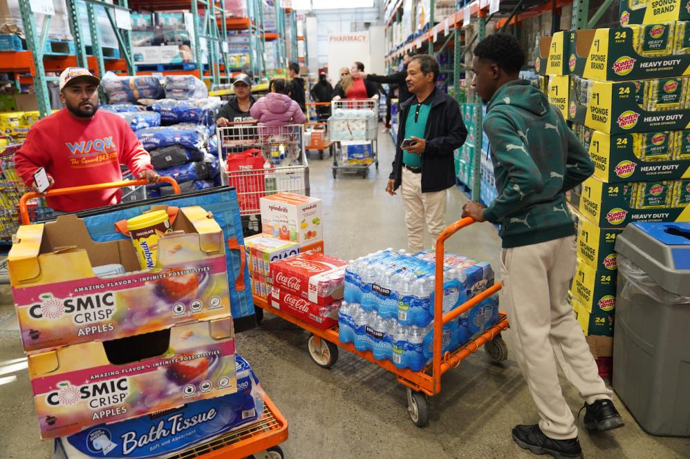 4月10日,人們?cè)诿绹~約一家超市購買生活用品。新華社記者 張鳳國 攝
