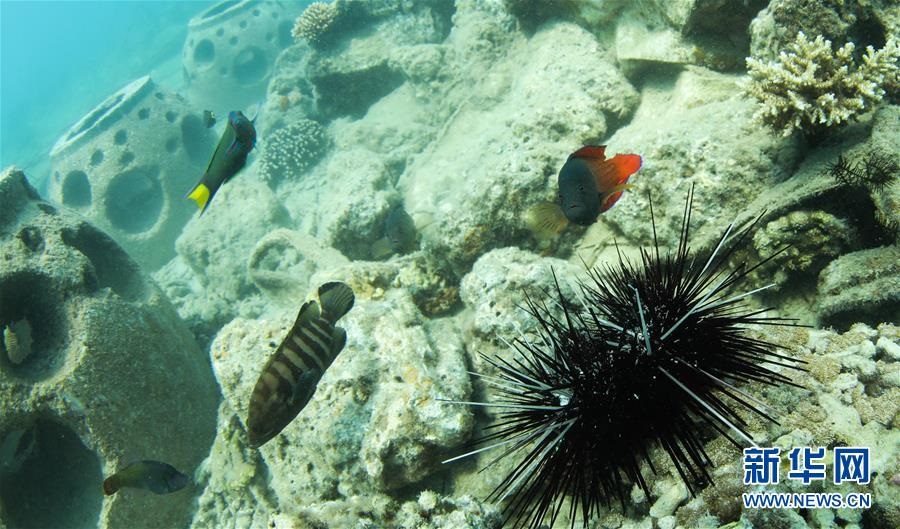 在海南三亞蜈支洲島海域,魚(yú)兒在海洋牧場(chǎng)的人工魚(yú)礁附近覓食(3月28日攝)。新華社記者楊冠宇攝