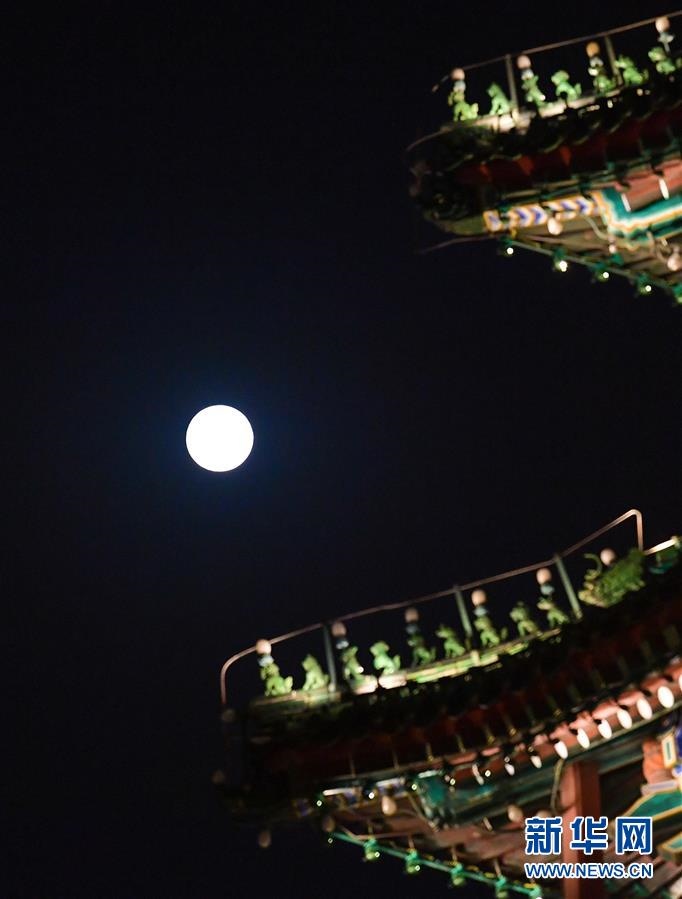 10月1日在北京前門商業(yè)街拍攝的木雕龍頭和月亮。當日是農(nóng)歷八月十五,傳統(tǒng)的中秋節(jié)與國慶節(jié)相遇,共迎圓月。新華社記者李賀攝