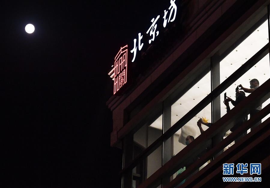10月1日,幾位游客駐足在北京坊的建筑內(nèi)拍攝夜景。當日是農(nóng)歷八月十五,傳統(tǒng)的中秋節(jié)與國慶節(jié)相遇,共迎圓月。新華社記者李賀攝