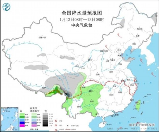 全國降水量預(yù)報圖(1月12日8時-13日8時)