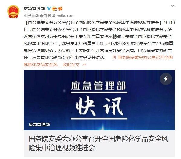 1月13日,國(guó)務(wù)院安委會(huì)辦公室召開(kāi)全國(guó)危險(xiǎn)化學(xué)品安全風(fēng)險(xiǎn)集中治理視頻推進(jìn)會(huì),安排全國(guó)危險(xiǎn)化學(xué)品安全風(fēng)險(xiǎn)集中治理工作,部署歲末年初重點(diǎn)工作,推動(dòng)2022年?;钒踩a(chǎn)各項(xiàng)重點(diǎn)任務(wù)落地見(jiàn)效,為黨的二十大勝利召開(kāi)營(yíng)造良好安全環(huán)境。