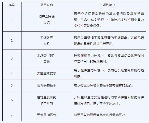 本次太空授課活動(dòng)將繼續(xù)采取天地互動(dòng)方式進(jìn)行,3名航天員將在軌介紹展示中國空間站問天實(shí)驗(yàn)艙工作生活場景,演示微重力環(huán)境下毛細(xì)效應(yīng)實(shí)驗(yàn)、水球變“懶”實(shí)驗(yàn)、太空趣味飲水、會(huì)調(diào)頭的扳手以及植物生長研究項(xiàng)目介紹,并與地面課堂進(jìn)行互動(dòng)交流(授課內(nèi)容介紹附后),旨在傳播普及載人航天知識(shí),激發(fā)廣大青少年對科學(xué)的興趣。