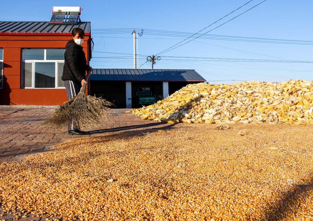 11月3日,在內(nèi)蒙古自治區(qū)通遼市開魯縣開魯鎮(zhèn)飛機(jī)場村,一名村民在院中晾曬玉米。 新華社記者連振 攝