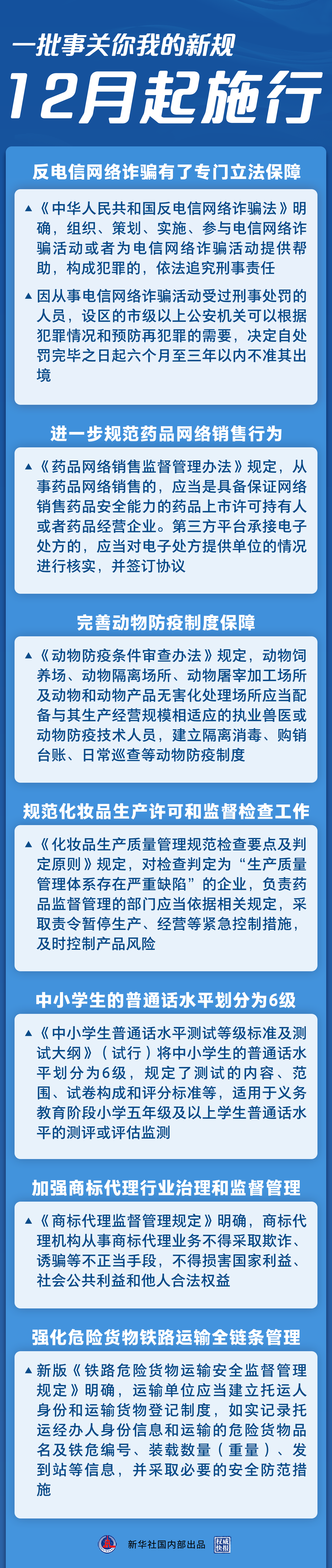 2022年的最后一個月,一批事關你我的新規(guī)開始施行。反電信網(wǎng)絡詐騙有了專門立法保障,中小學生的普通話水平有了規(guī)范標準,藥品網(wǎng)絡銷售平臺責任進一步壓實……法治,為美好生活助力。