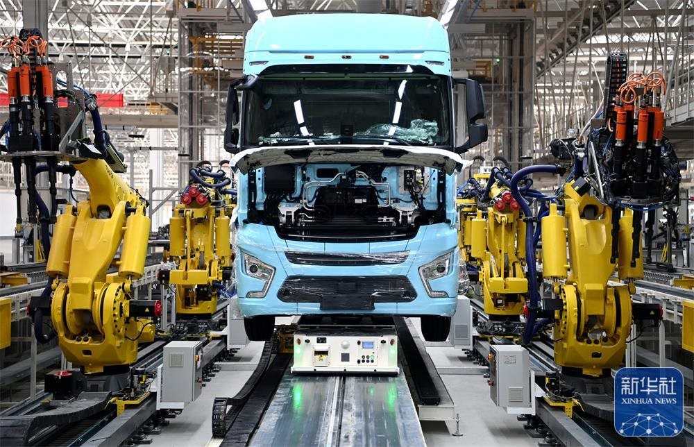 在陜汽重卡擴(kuò)能項目現(xiàn)場,一輛重卡在汽車總裝生產(chǎn)線輪胎自動化裝配擰緊無人工作站進(jìn)行裝配(9月27日攝)。新華社記者 劉瀟 攝