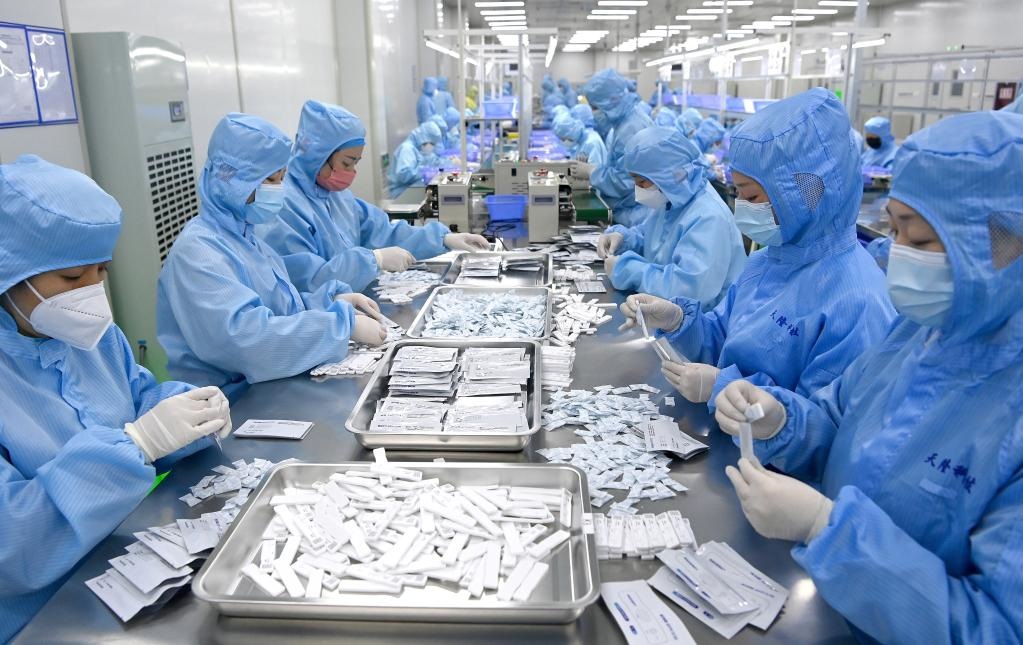 西安一家醫(yī)療器械企業(yè)的工作人員在生產(chǎn)抗原檢測(cè)試劑(2023年1月4日攝)。 新華社記者 劉瀟 攝