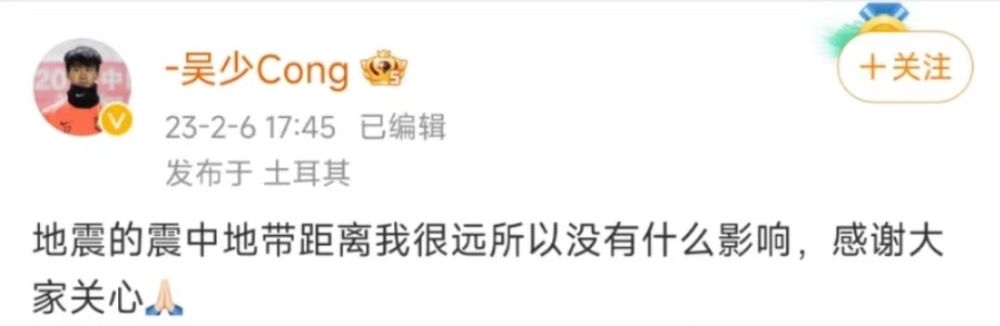 新華社北京2月7日電 土耳其發(fā)生強(qiáng)烈地震后,效力于土耳其職業(yè)聯(lián)賽的中國女足運(yùn)動(dòng)員李佳悅、男足運(yùn)動(dòng)員吳少聰,以及女排運(yùn)動(dòng)員任凱懿先后在社交媒體平臺(tái)上報(bào)平安。