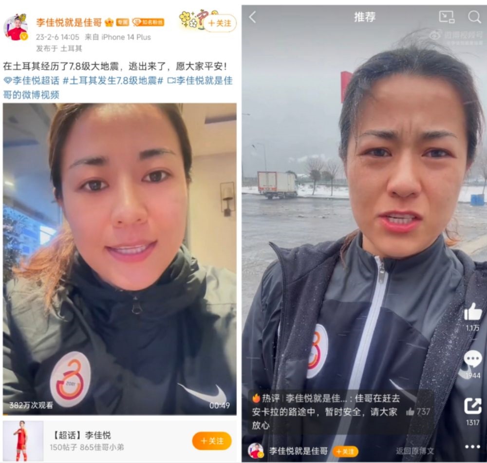 今年1月,李佳悅從上海農(nóng)商銀行女足轉(zhuǎn)會(huì)土耳其加拉塔薩雷女足。她6日于個(gè)人社交媒體賬號(hào)上發(fā)布兩條視頻,表示地震發(fā)生前自己正隨隊(duì)在震中附近區(qū)域比賽,目前,她正在趕往土耳其首都安卡拉的途中。