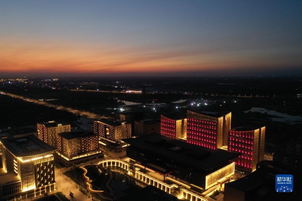 這是雄安新區(qū)商務服務中心夜景(2022年9月7日攝,無人機照片)。新華社記者 朱旭東 攝
