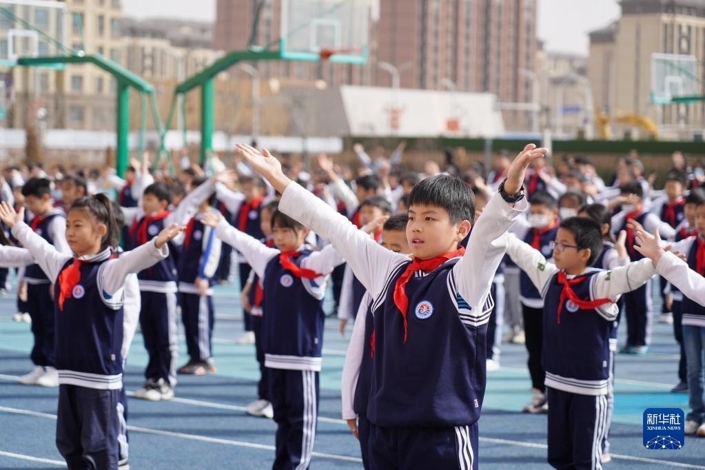 雄安新區(qū)容西片區(qū)云溪小學的學生在操場上做操(2023年3月23日攝)。新華社記者 牟宇 攝