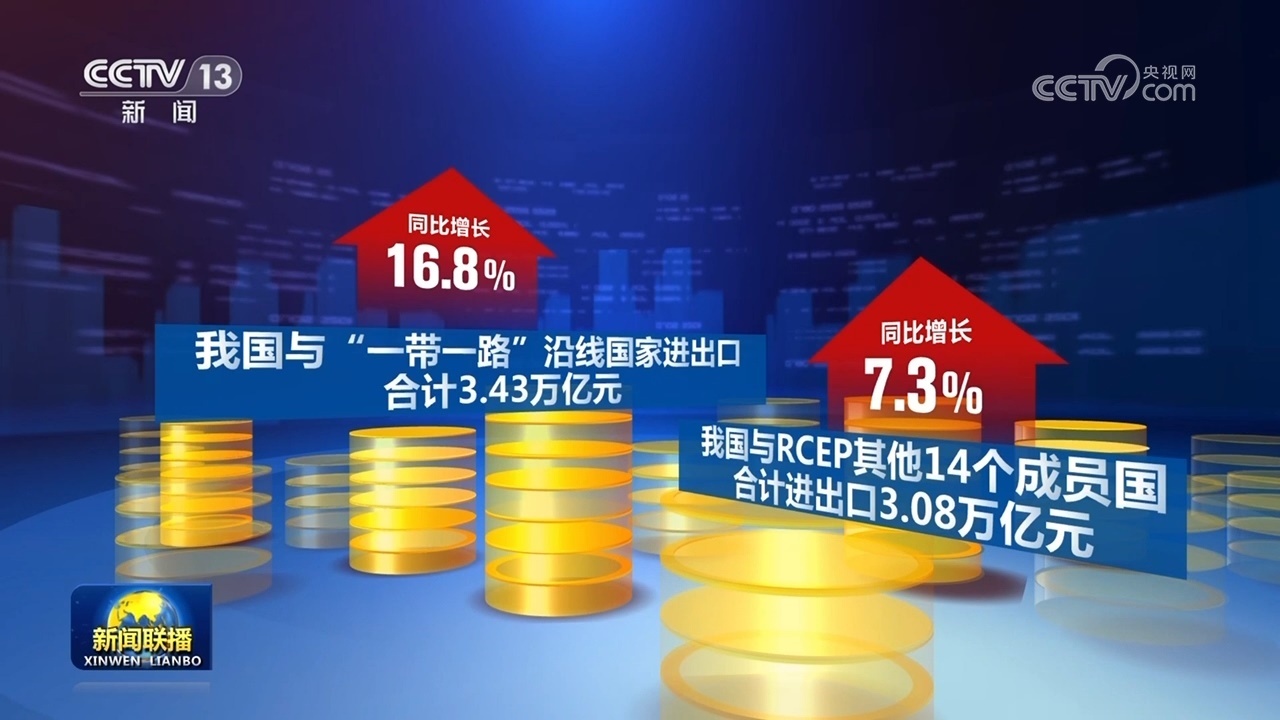 同期,我國(guó)與“一帶一路”沿線國(guó)家進(jìn)出口合計(jì)3.43萬(wàn)億元,同比增長(zhǎng)16.8%。我國(guó)與RCEP其他14個(gè)成員國(guó)合計(jì)進(jìn)出口3.08萬(wàn)億元,同比增長(zhǎng)7.3%。
