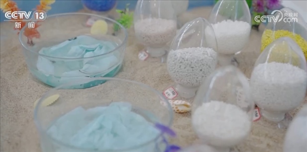 2020年海南以立法形式實(shí)施全域禁塑,在綠色消費(fèi)展臺可以看到不同顏色的全降解材料。左邊的這個(gè)器皿里裝的是剛剛放進(jìn)去的可降解塑料袋,右邊這個(gè)器皿展示的是它溶于水7天后的效果,現(xiàn)在已經(jīng)無法使用了,隨著時(shí)間的推移,最終可以完全變成二氧化碳和水。