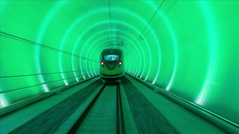 2023年4月9日,云南西雙版納,航拍中老鐵路友誼隧道,隧道內(nèi)各種燈光裝飾,隧道外墻畫展現(xiàn)文化特色。視覺中國(guó)