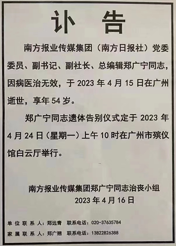 據南方報業(yè)傳媒集團發(fā)布的訃告,南方報業(yè)傳媒集團(南方日報社)黨委委員、副書記、副社長、總編輯鄭廣寧同志,因病醫(yī)治無效,于2023年4月15日在廣州逝世,享年54歲。