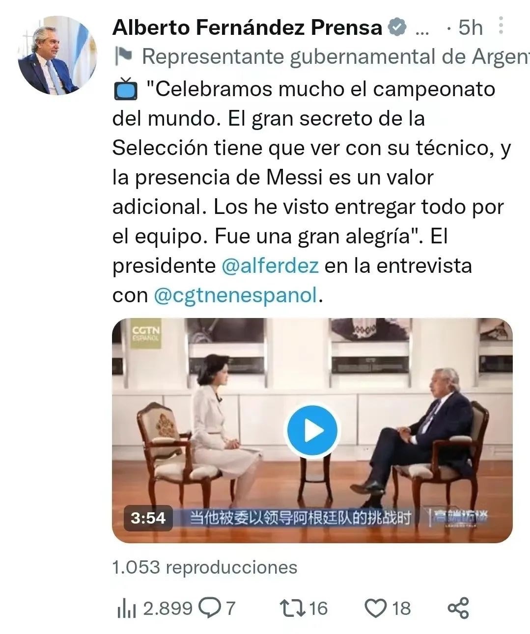 △阿根廷總統(tǒng)費爾南德斯個人賬號發(fā)布十余條推文展示專訪內容