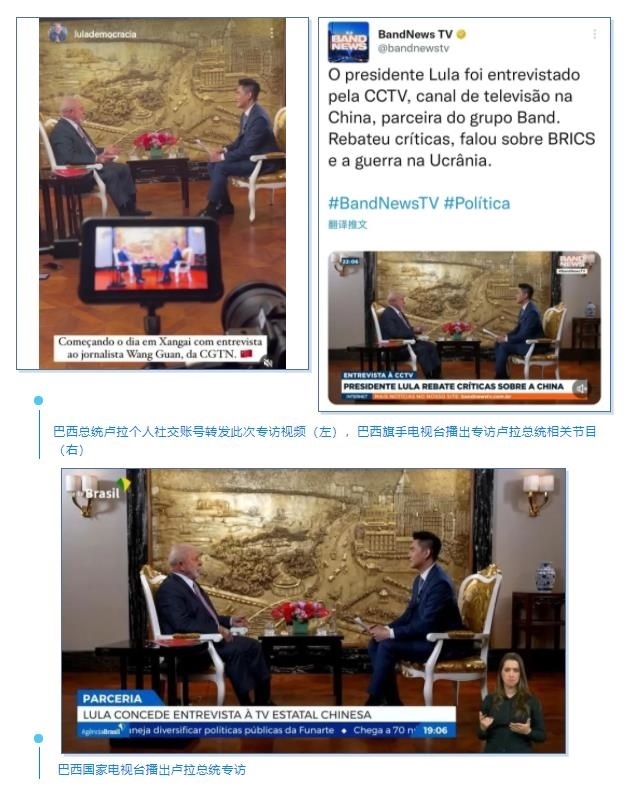 盧拉總統(tǒng)在其個人社交賬號轉發(fā)此次專訪視頻。巴西第二大電視臺旗手電視臺綜合頻道,在當?shù)貢r間4月14日晚率先播出總臺《高端訪談》專訪盧拉總統(tǒng)的精華版,觸達巴西全境,完整版專訪于次日在該臺各頻道多次播出。巴西最大新聞門戶網站UOL、知名雜志《論壇》等也陸續(xù)上線本次專訪節(jié)目。