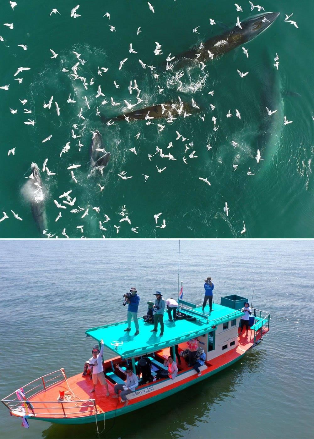 (拼版照片)上圖:布氏鯨在中國廣西潿洲島附近海域捕食(2022年2月22日攝)。下圖:中泰兩國科研人員在泰國灣對(duì)布氏鯨進(jìn)行聯(lián)合調(diào)查(2019年10月25日攝)。中泰兩國科研人員攜手研究保護(hù)布氏鯨這個(gè)近岸大型鯨類,圍繞布氏鯨調(diào)查技術(shù)、調(diào)查方法以及其他海洋哺乳動(dòng)物的研究和數(shù)據(jù)處理方法進(jìn)行交流與合作。