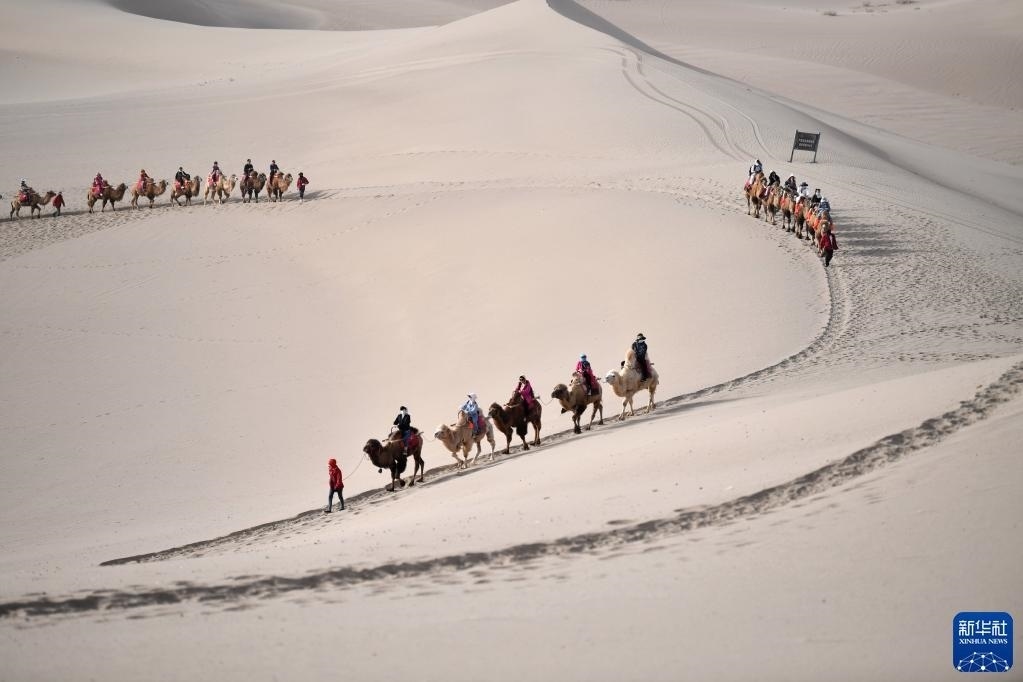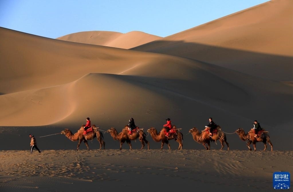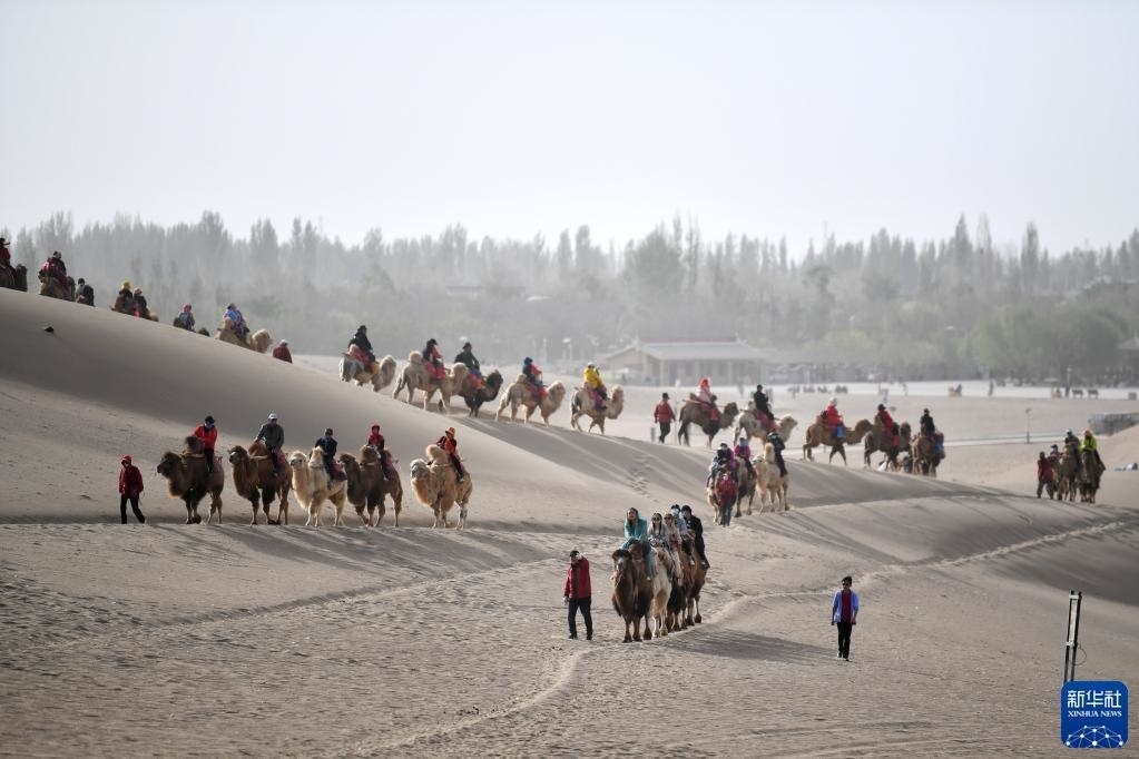 駝隊載著游客行走在鳴沙山月牙泉景區(qū)的駝道上(4月24日攝)。   新華社記者 陳斌 攝