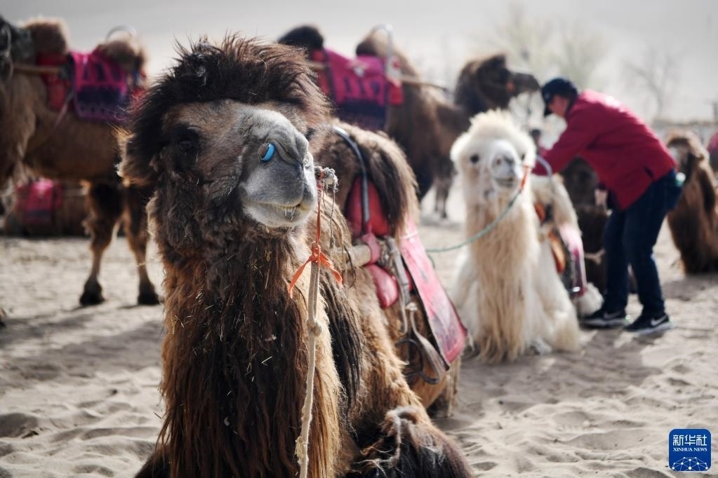 編號“414”的駱駝(前)在鳴沙山月牙泉景區(qū)駱駝騎乘點休息等待游客(4月24日攝)。   新華社記者 陳斌 攝