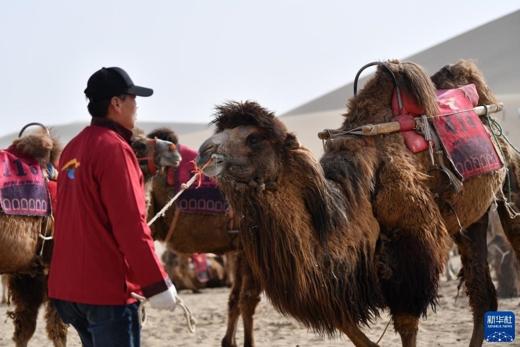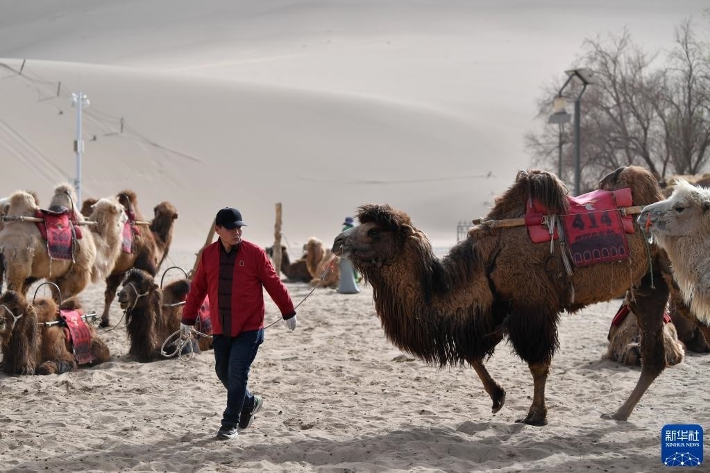 曹文華牽著駱駝在鳴沙山月牙泉景區(qū)駱駝騎乘點等待游客(4月24日攝)。   新華社記者 方欣 攝