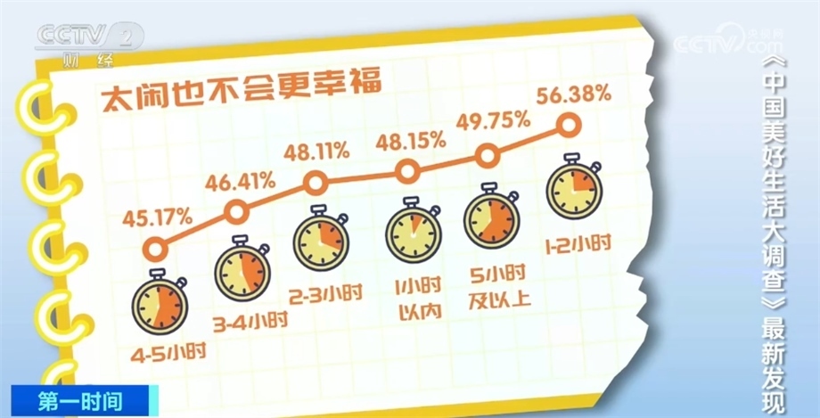 越忙碌的人,幸福感越低嗎?不一定。大調(diào)查發(fā)現(xiàn),休閑時間1—2小時的人群,幸福感最高,達(dá)到56.38%。休閑時間5小時以上人群中,感到幸福的比例只有49.75%。此后,除了沒有休閑時間人群外,隨著休閑時間的增加,感到幸福的人群比例是降低的??梢姡m當(dāng)?shù)拿β底屔畛錆M節(jié)奏感,幸福也來得更踏實。