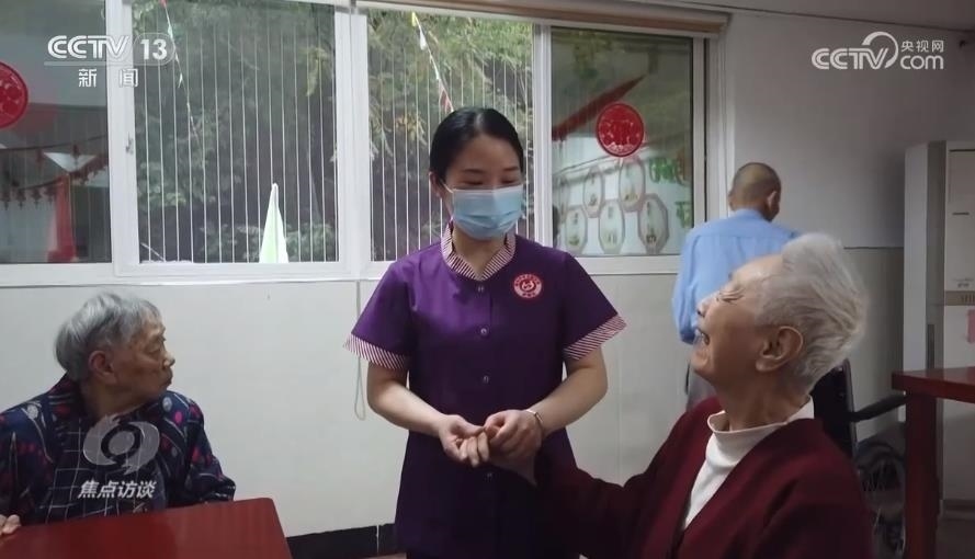 重慶市江津區(qū)雙福街道養(yǎng)老服務(wù)中心護(hù)理員熊曉麗:“這個(gè)時(shí)候我還是一樣的,先陪伴,先讓他對(duì)我產(chǎn)生依賴,然后我在跟他聊天的過程當(dāng)中才發(fā)現(xiàn),原來王爺爺以前喜歡唱歌?!?/p>