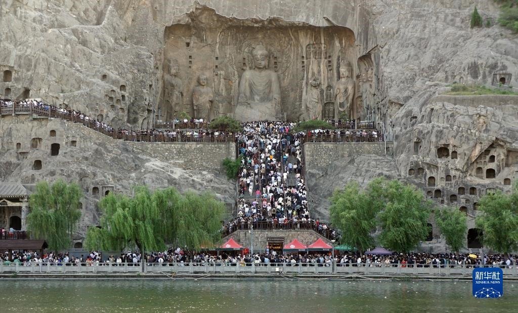 4月30日,游客在河南洛陽龍門石窟景區(qū)游覽。