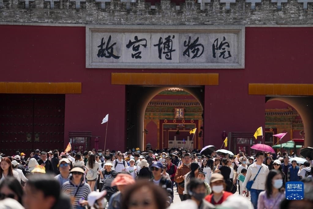 4月29日,游客在參觀結束后走出故宮博物院。