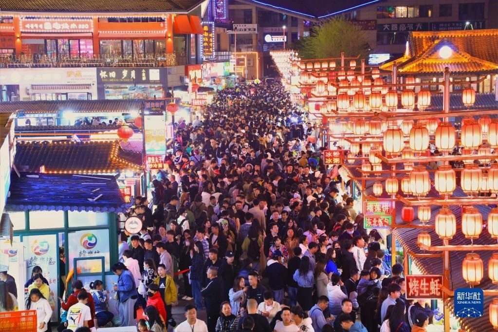 4月30日,游客在湖北襄陽古城北街游玩。