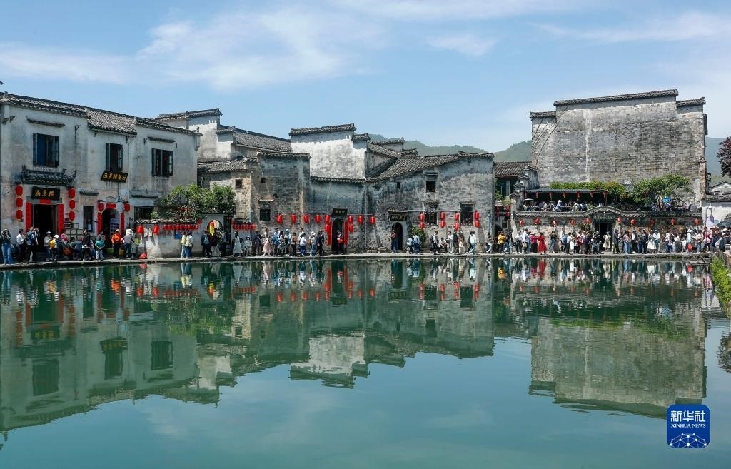 4月30日,游客在安徽省黃山市黟縣宏村參觀游玩。