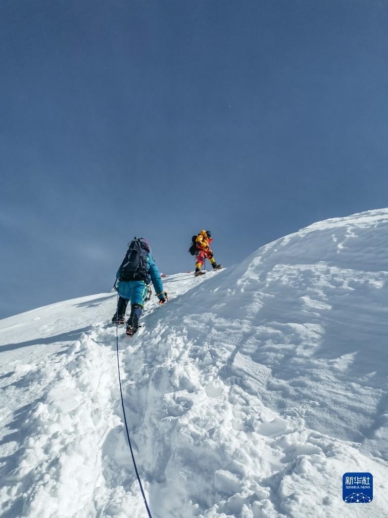 董紅娟(左)在登頂希夏邦馬峰后下撤(4月26日攝)。新華社發(fā)(頓巴 攝)