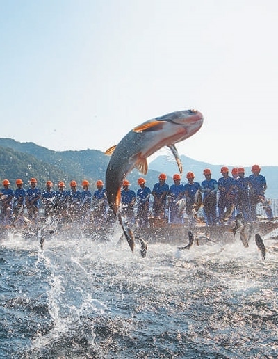 浙江省杭州市淳安縣千島湖國家級水產(chǎn)種質(zhì)資源保護(hù)區(qū)內(nèi),漁民在進(jìn)行“巨網(wǎng)捕魚”。謝航凱攝(影像中國)