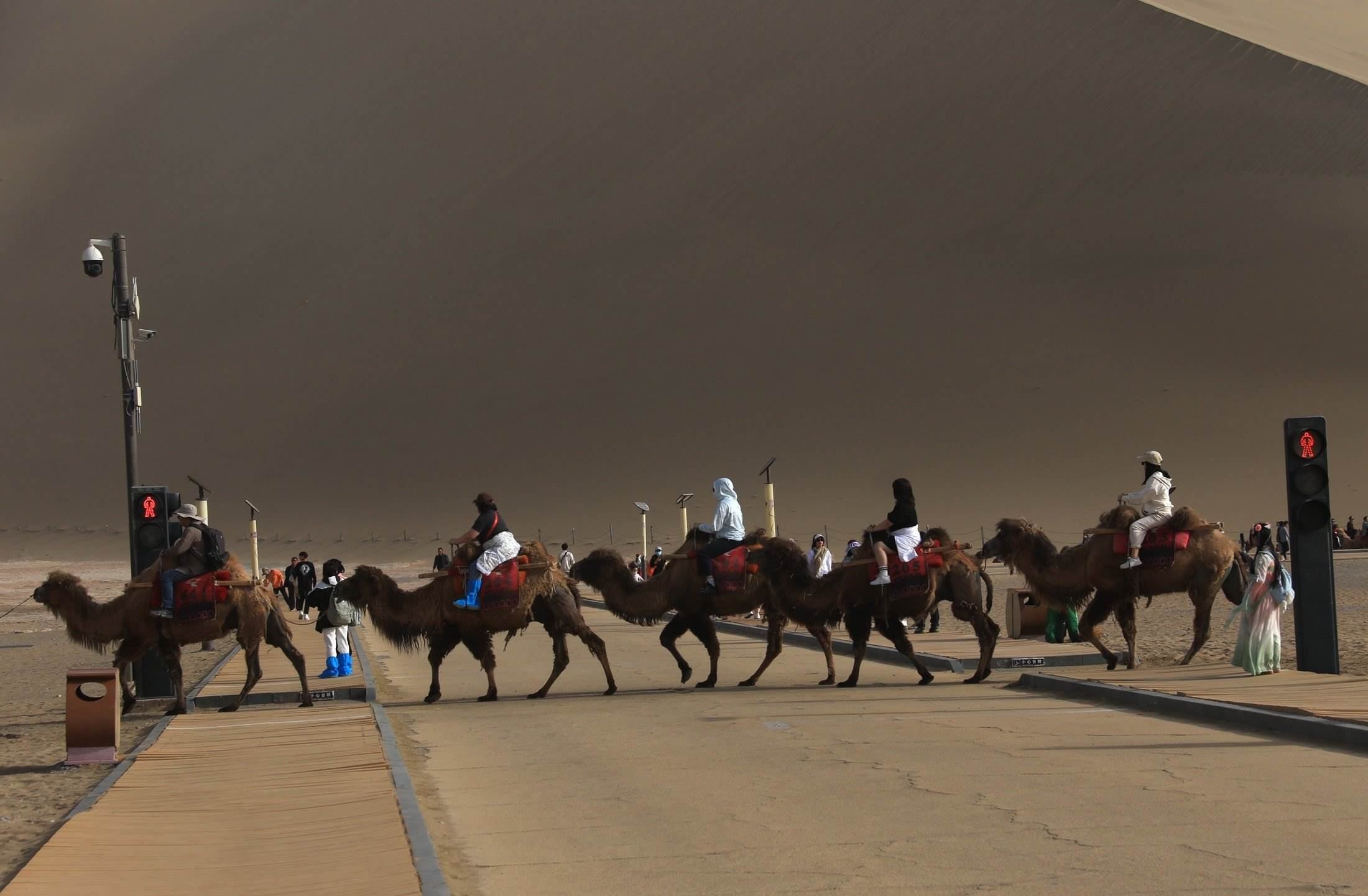 “五一”假期,甘肅省敦煌市鳴沙山月牙泉景區(qū)迎來旅游高峰。設置在該景區(qū)內行人步道和駱駝通道兩個交叉點的“駱駝紅綠燈”,引導人、車和駱駝有序分流,不僅確保了景區(qū)交通安全暢通,也成為景區(qū)內的“網紅打卡點”之一 。