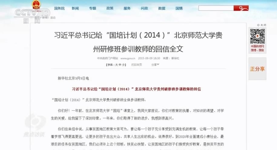 2014年9月,黃俊瓊和49名來(lái)自貴州的小學(xué)骨干語(yǔ)文教師到北京師范大學(xué)參加“中小學(xué)教師國(guó)家級(jí)培訓(xùn)計(jì)劃”,也就是“國(guó)培計(jì)劃”。培訓(xùn)期間,有件事讓她終身難忘。當(dāng)時(shí),習(xí)近平總書(shū)記到北京師范大學(xué)考察,專門(mén)和他們進(jìn)行了座談。