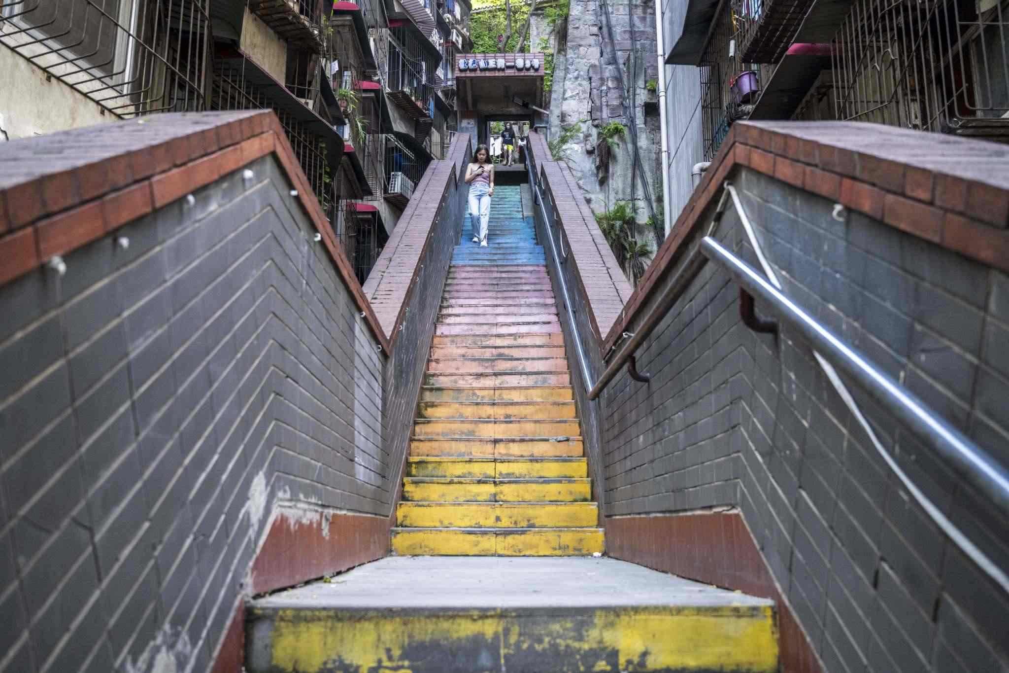 “彩虹樓梯”位于重慶渝中區(qū)枇杷山正街的居民樓間,高約20米,共有50多級(jí)階梯,極具山城特色。經(jīng)過(guò)多種顏色涂鴉后,吸引不少市民和攝影愛(ài)好者“打卡”。視覺(jué)中國(guó)