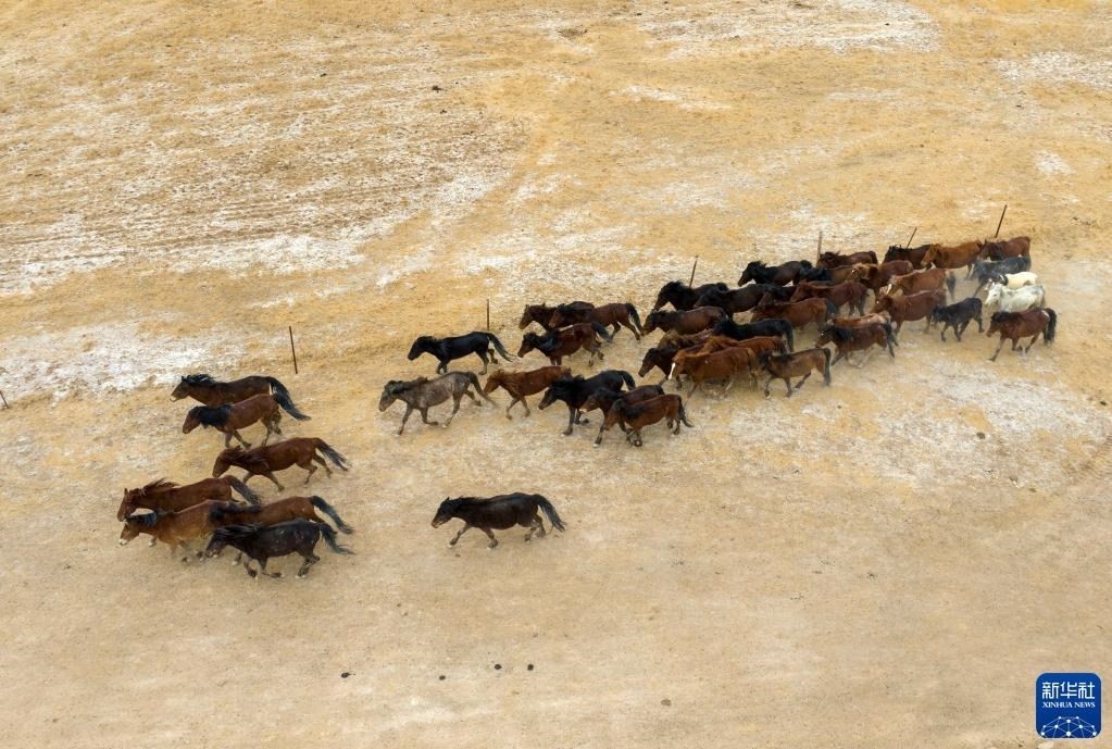 5月3日,在阿克塞縣阿伊納鄉(xiāng)海子草原,牧民趕著馬群進(jìn)行轉(zhuǎn)場(無人機(jī)照片)。