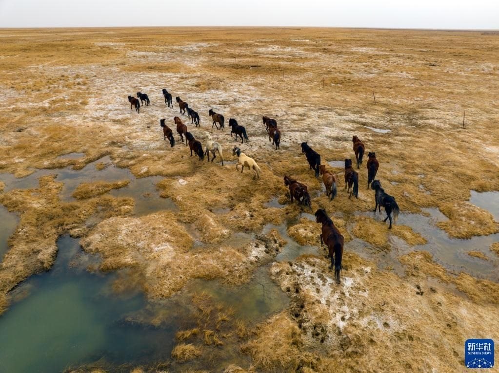 5月3日,在阿克塞縣阿伊納鄉(xiāng)海子草原,馬群轉(zhuǎn)場去往夏季牧場(無人機(jī)照片)。