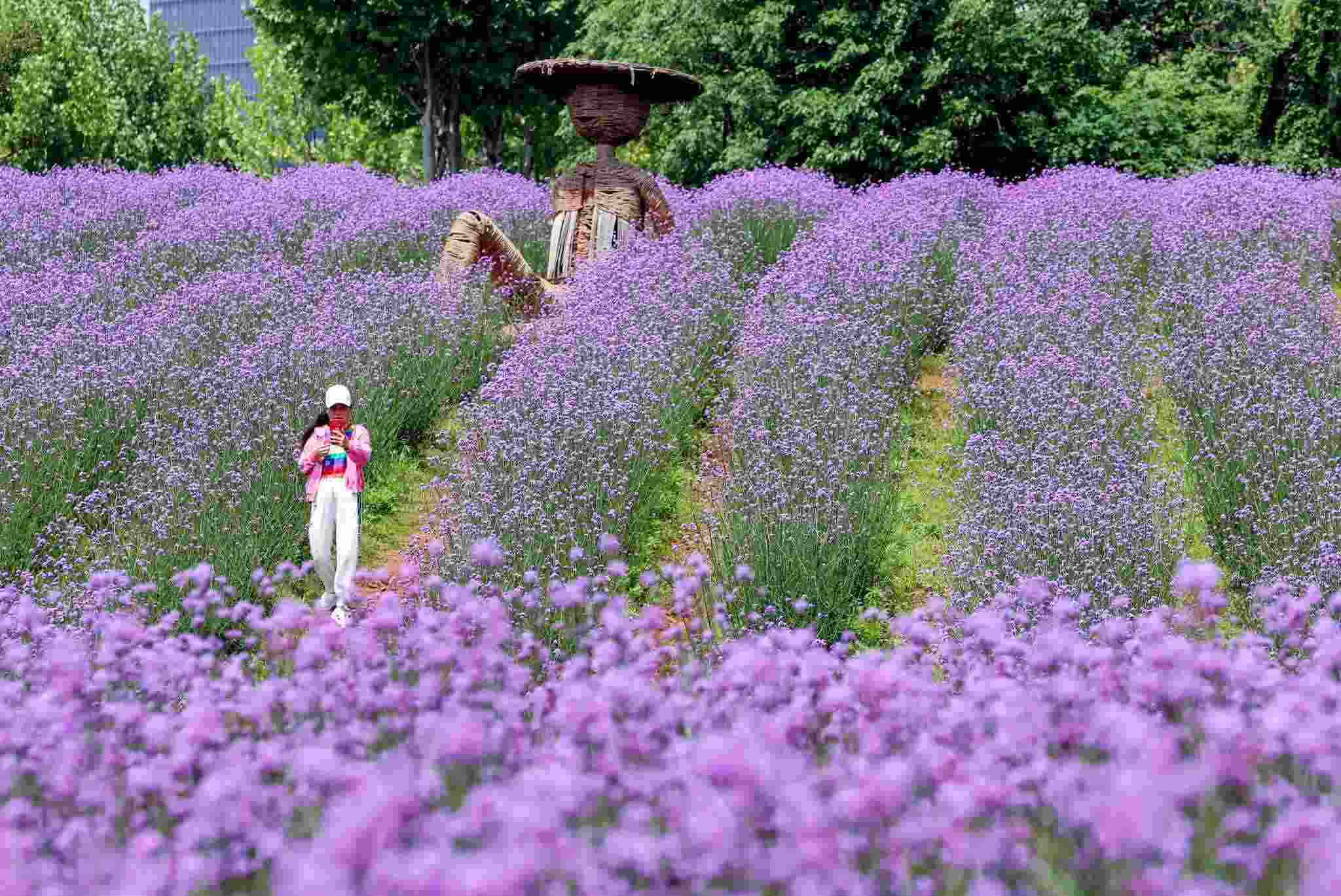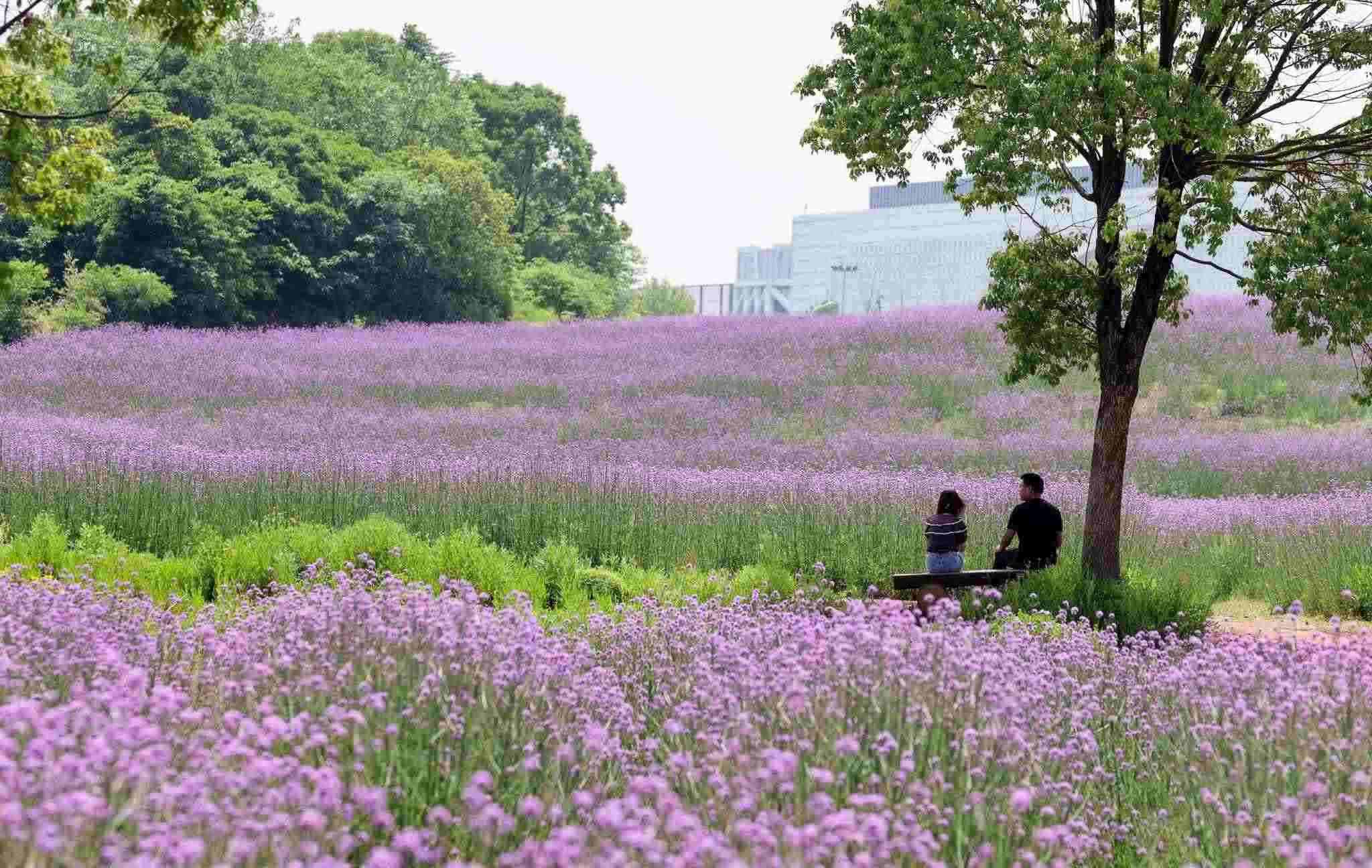 近日,湖北武漢光谷中央生態(tài)大走廊最北端的九峰一路,馬鞭草競相綻放,吸引不少市民和游客來此賞花。視覺中國