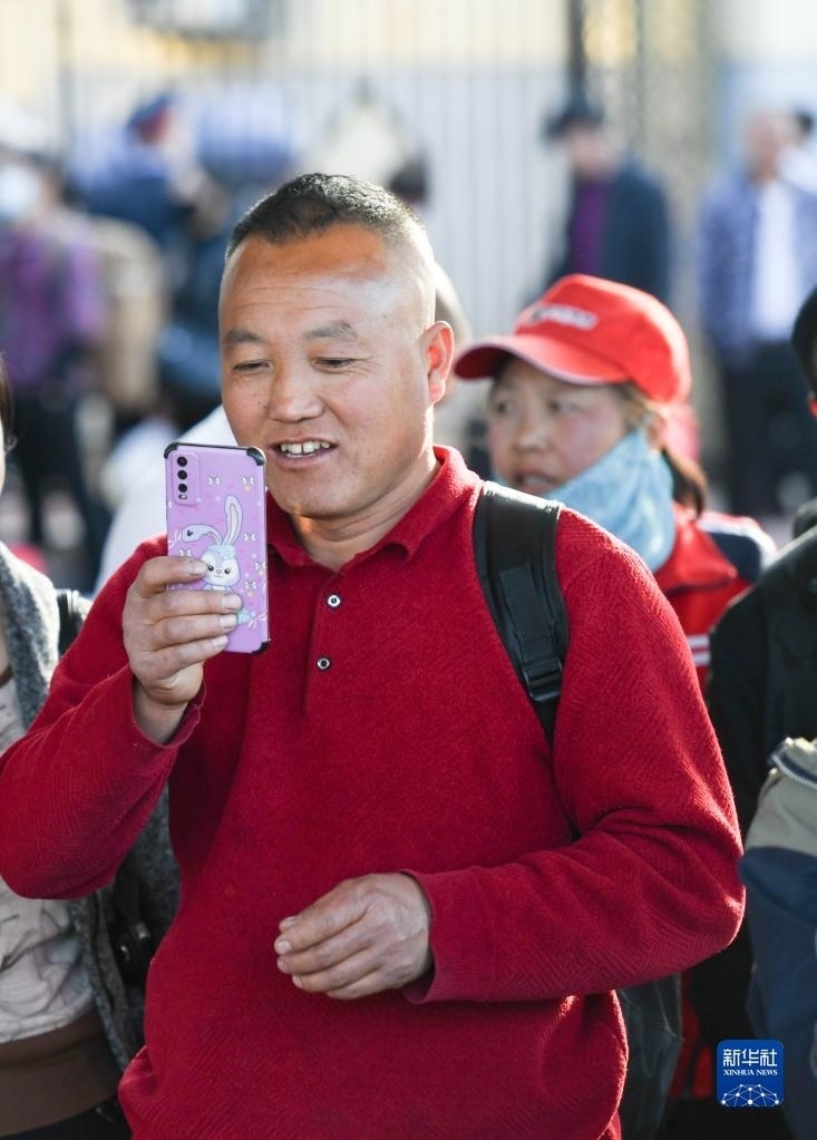 在綏化火車站站臺,乘客在等候K5151次列車時與親友視頻通話(5月6日攝)。   新華社記者 王松 攝