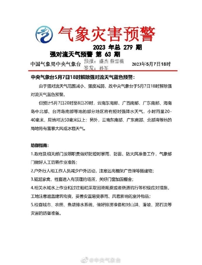 央視網(wǎng)消息:中央氣象臺5月7日18時解除暴雨藍色預(yù)警和強對流天氣藍色預(yù)警。