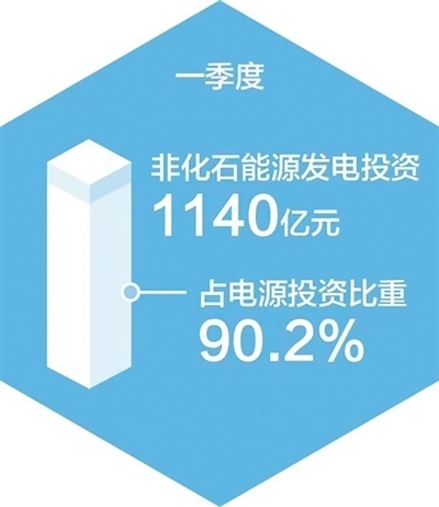 非化石能源發(fā)電投資較快增長(zhǎng)。一季度,全國(guó)主要發(fā)電企業(yè)電源工程完成投資1264億元,同比增長(zhǎng)55.2%,其中非化石能源發(fā)電投資1140億元,同比增長(zhǎng)62.8%,占電源投資的比重達(dá)到90.2%。具體看,太陽(yáng)能發(fā)電、核電、風(fēng)電投資同比分別增長(zhǎng)177.6%、53.5%、15%。