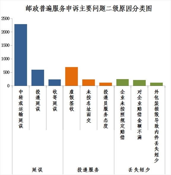 2.郵政普遍服務(wù)申訴主要問(wèn)題二級(jí)原因情況。郵件延誤申訴中主要占比較多的是中轉(zhuǎn)或運(yùn)輸延誤,投遞服務(wù)申訴中主要占比較多的是虛假簽收,郵件丟失短少申訴中主要占比較多的是企業(yè)未按照規(guī)定賠償。