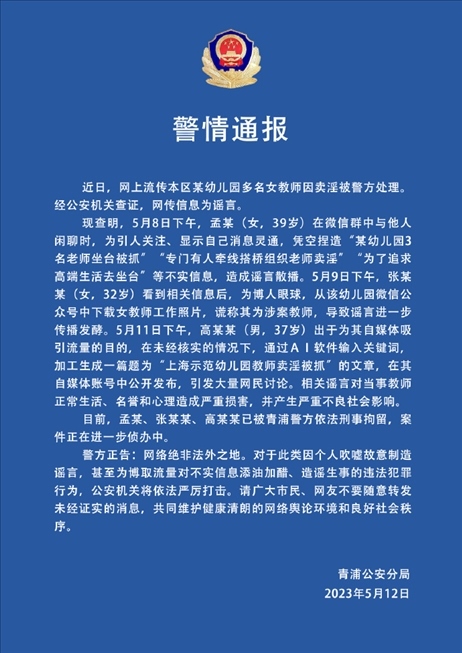 ·上海青浦警方:網(wǎng)傳幼兒園多名女教師賣(mài)淫被處理系謠言,刑拘3人。