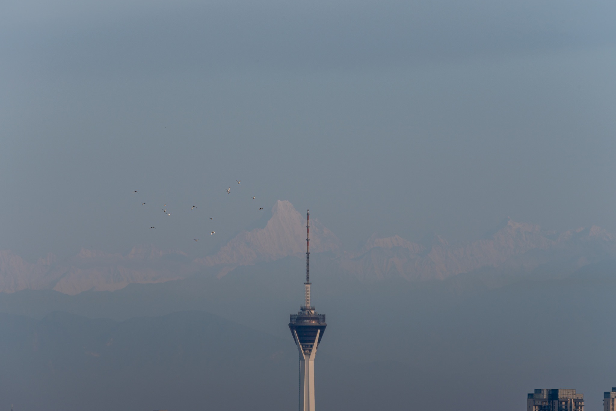 2023年5月13日,成都,幺妹峰露出真容,與城市建筑同框。視覺(jué)中國(guó)