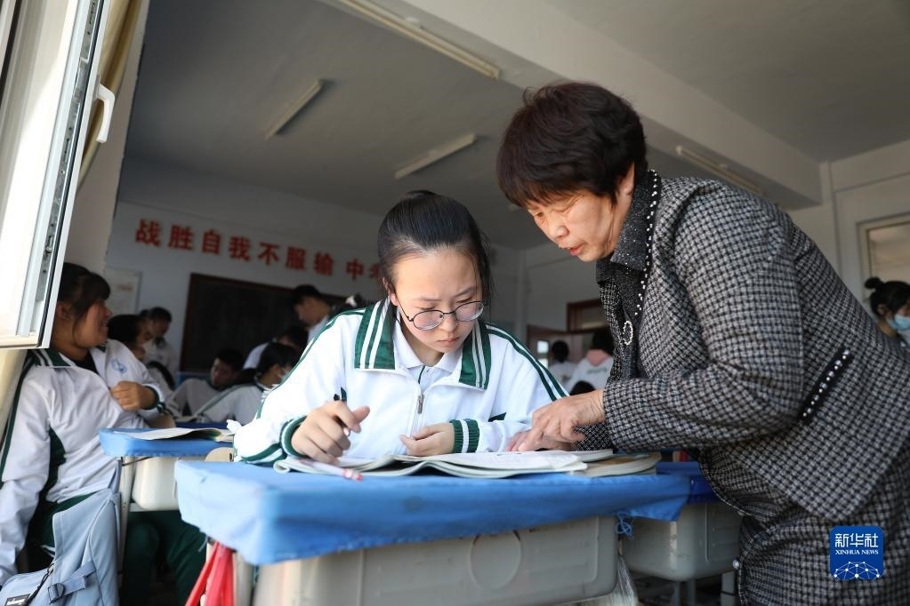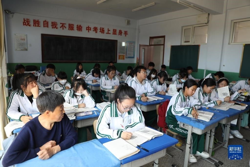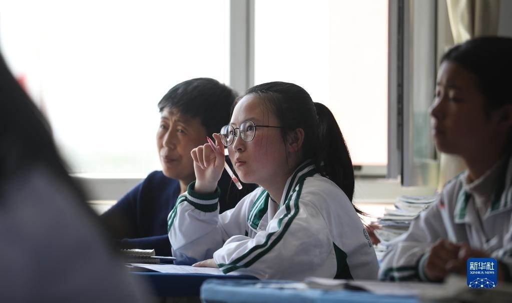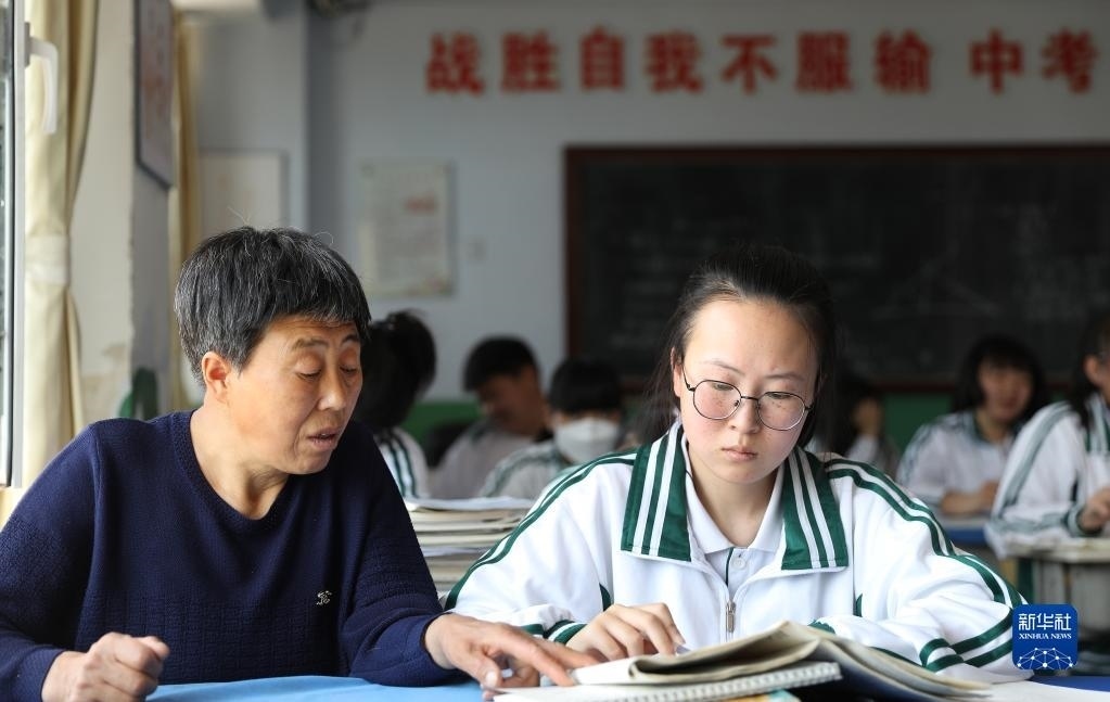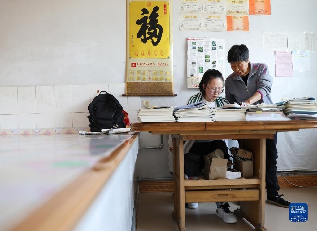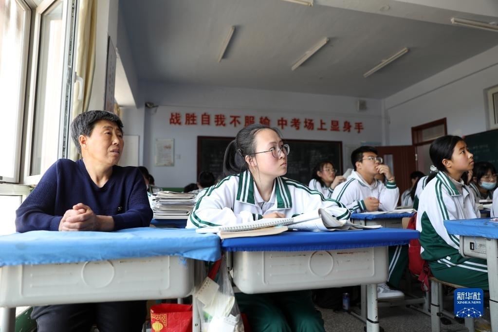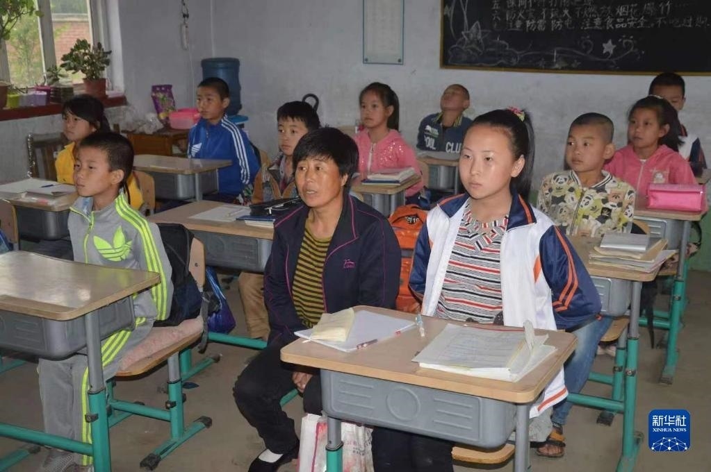 張連琴(左下)和女兒李昕偉在教室內聽課(5月8日攝)。