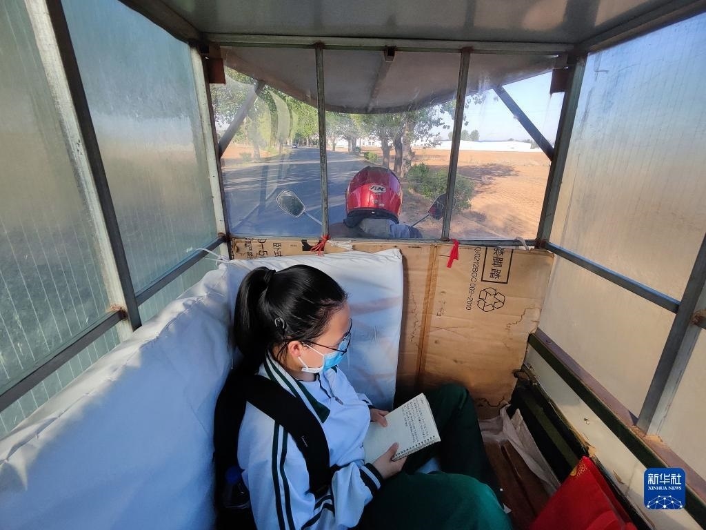 清晨,張連琴騎著電動三輪車拉著女兒李昕偉去上學,女兒在車棚內背誦詩詞(5月8日手機拍攝)。
